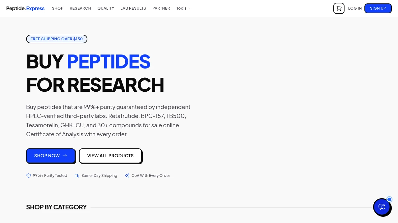 Buy research peptides with 99%+ HPLC-verified purity from Peptide.Express. Each compound is independently tested and comes with a Certificate of Analysis (CoA) to ensure quality. Our selection includes popular peptides like BPC-157, Semaglutide, Retatrutide, and CJC-1295, all synthesized in ISO 9001-certified US facilities. Enjoy same-day shipping on orders placed by 2 PM EST, and take advantage of free shipping on orders over $150. Each peptide is hermetically sealed in sterile vials and shipped in temperature-controlled packaging to maintain stability. With over 5,000 satisfied researchers, trust Peptide.Express for your research needs. Start your journey today and elevate your research with our premium peptides.